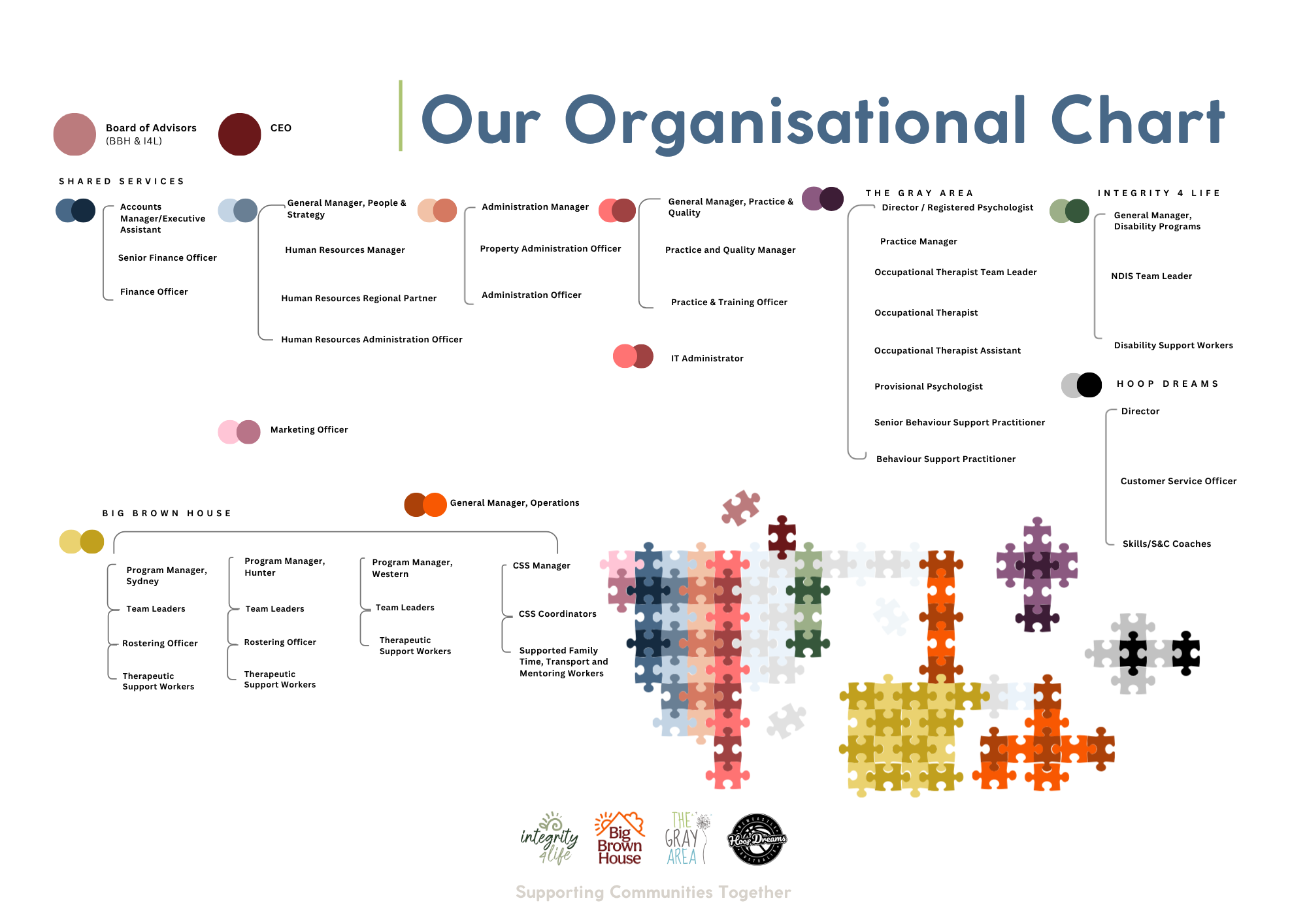 In our journey as a progressive organisation, the design of our new Organisation Chart was approached with a forward-thinking perspective. Opting for a jigsaw puzzle metaphor, the aim was to illustrate the interconnectedness, unity, and significance of each team member's contribution to the larger organisational picture. Each section of the organisation is distinguished by a unique colour, symbolising the diverse skill sets that collectively form our team culture.